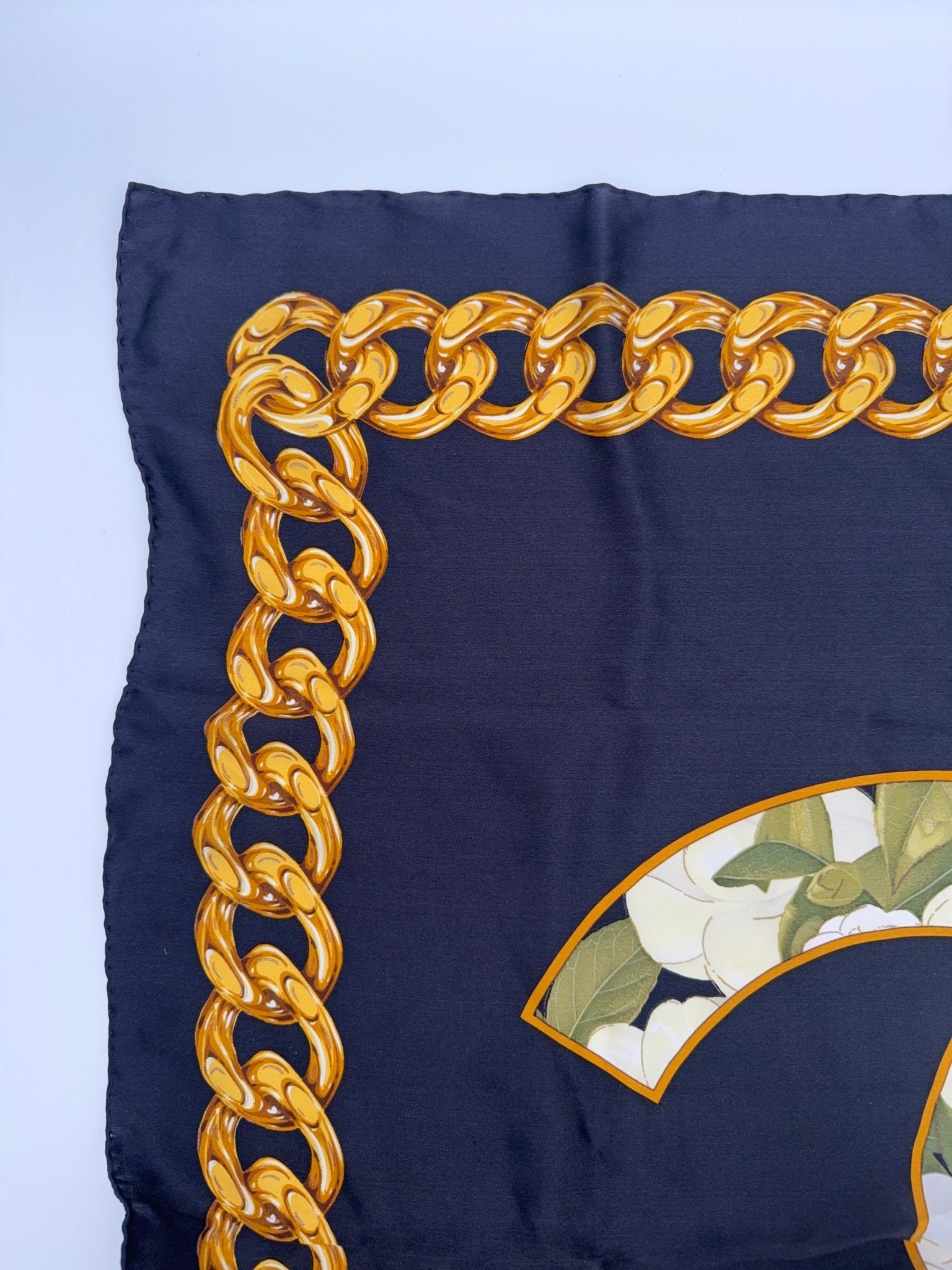Dieses elegante Chanel Seidentuch aus 100% Seide überzeugt durch sein stilvolles Design mit dem ikonischen CC-Logo, floralen Elementen und edlen Kettendetails. Die harmonische Farbgebung in Dunkelblau mit goldenen Akzenten macht dieses Tuch zu einem zeitlosen Accessoire für jede Garderobe.