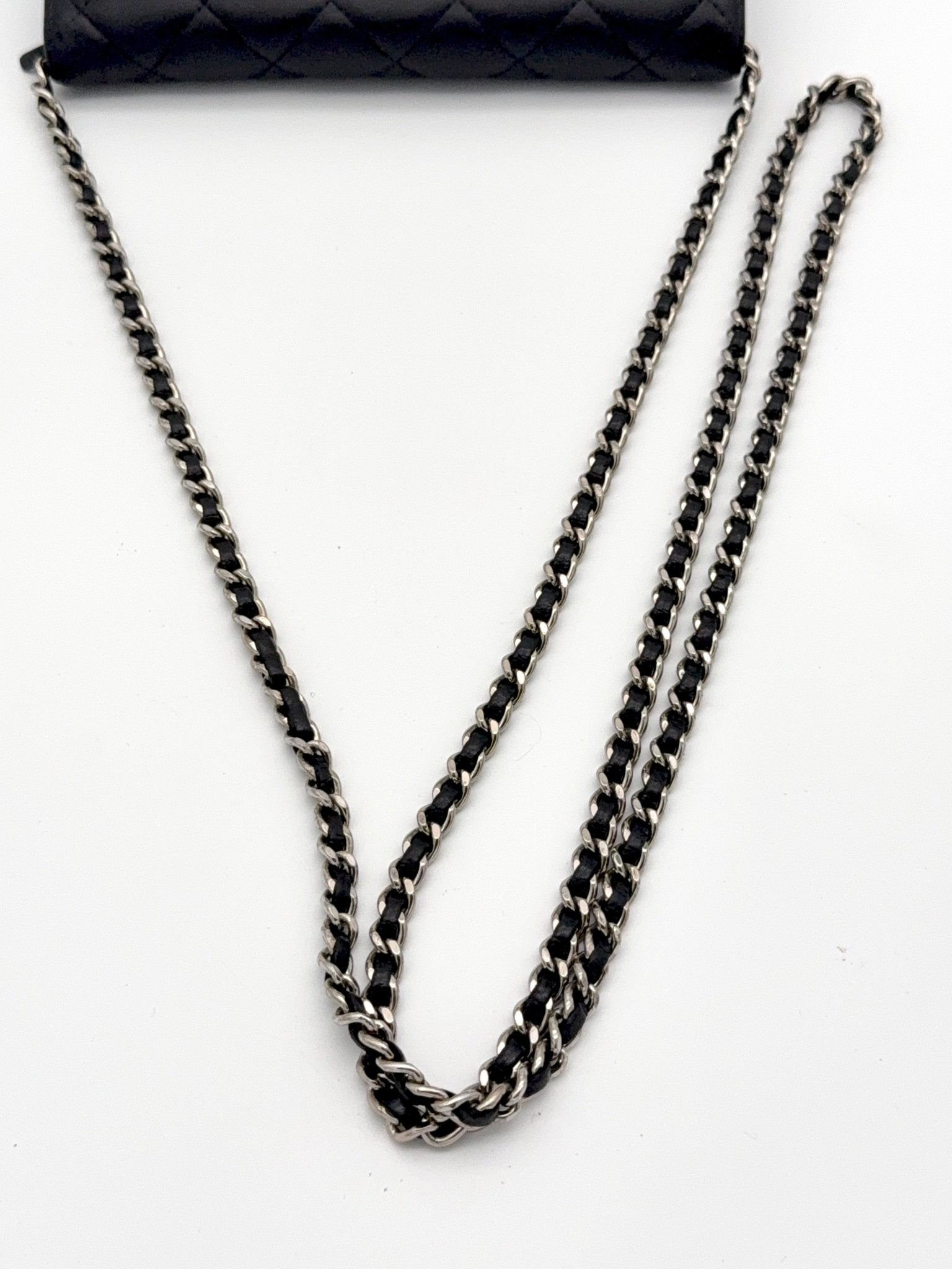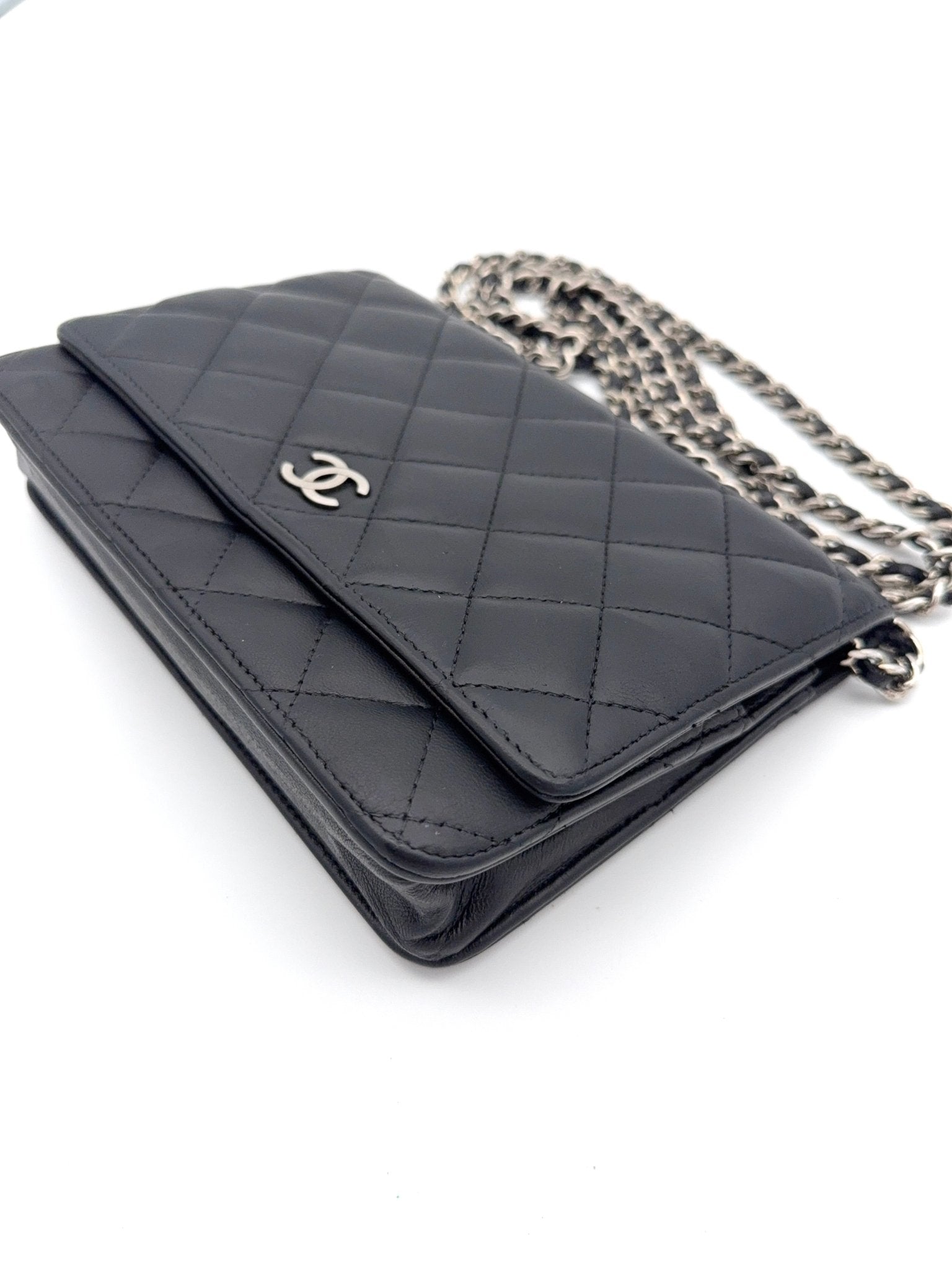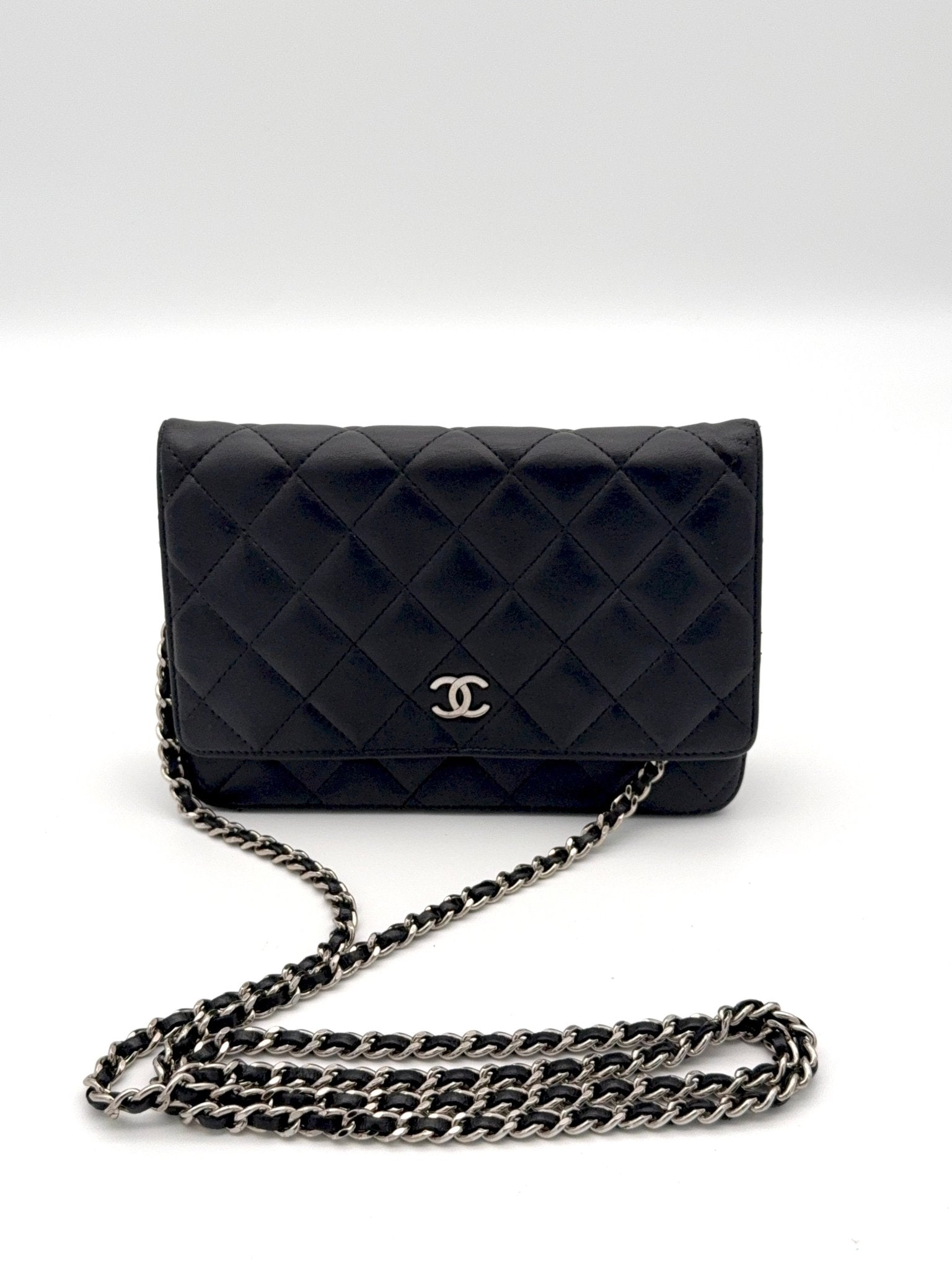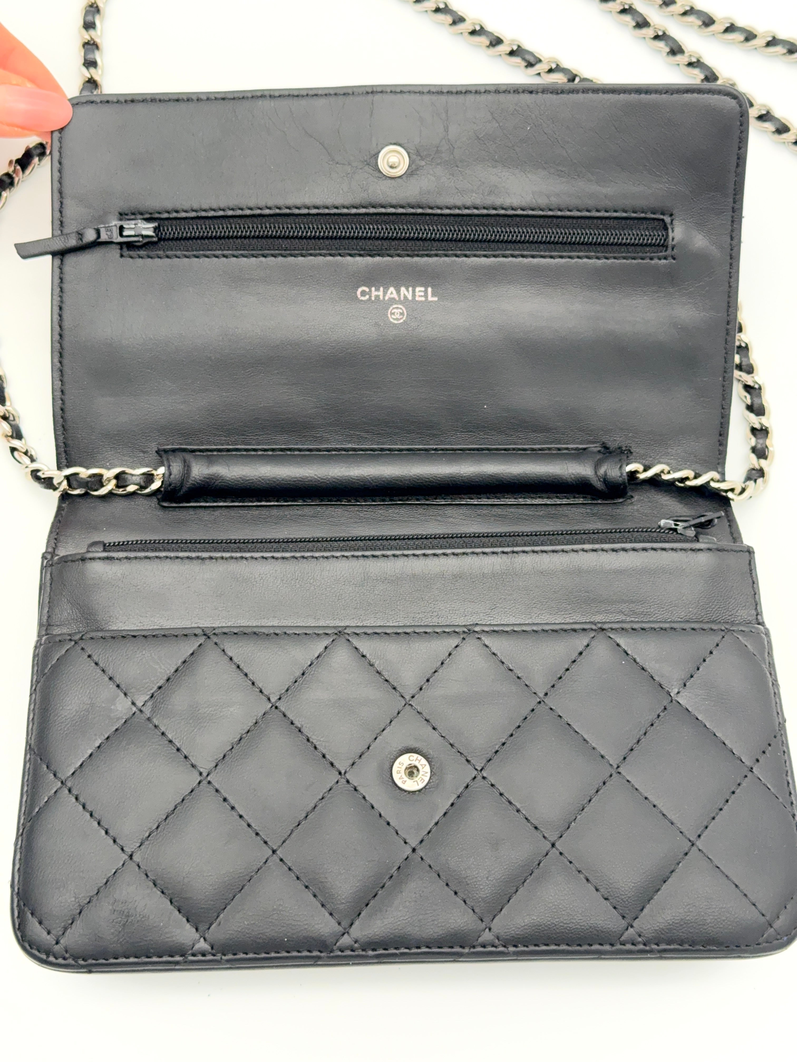 Die Chanel Wallet on Chain (WOC) aus schwarzem Lammleder mit silberner Hardware ist ein zeitloser Klassiker und eines der begehrtesten Modelle von Chanel. Sie vereint die Funktion einer Geldbörse mit dem edlen Look einer Designer Tasche und kann sowohl Crossbody als auch als Schultertasche getragen werden. Eine perfekte Kombination aus Eleganz, Komfort und Funktionalität.