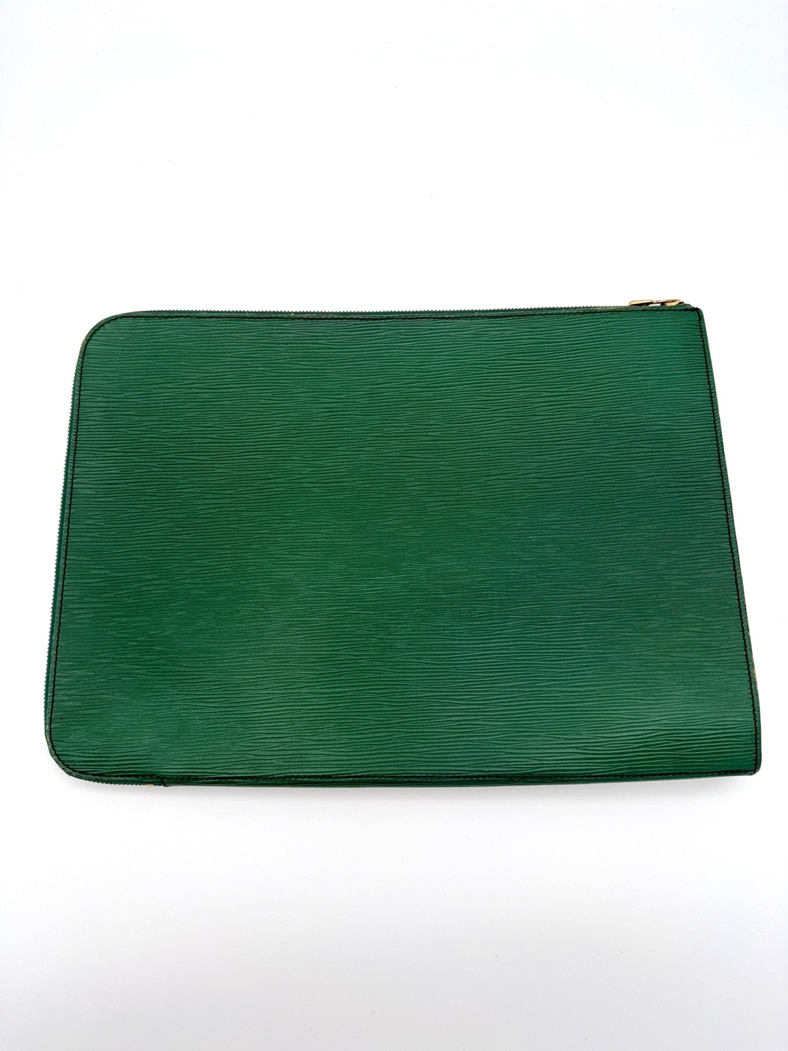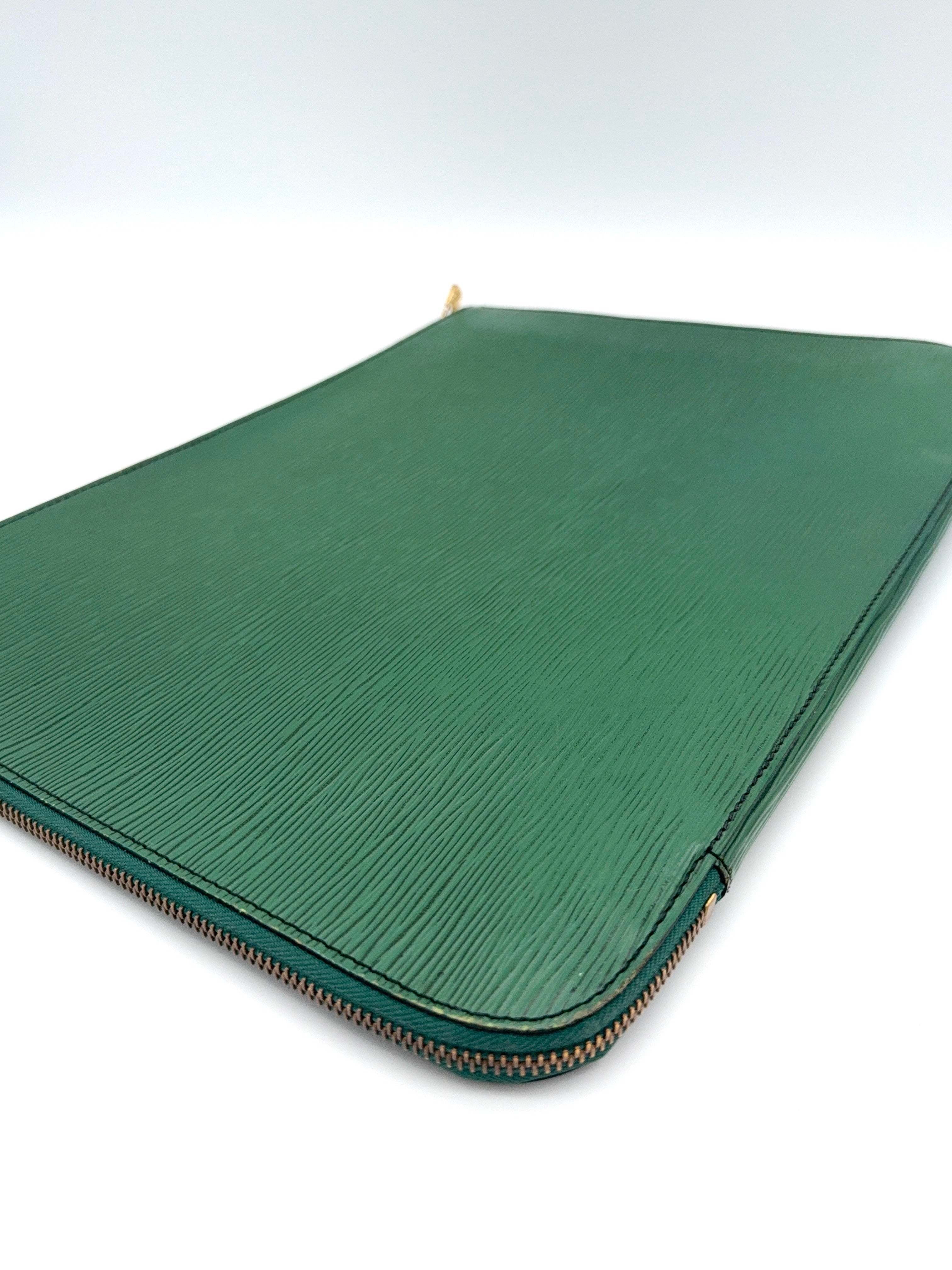 Diese Louis Vuitton Laptop Tasche aus grünem Epi Leder vereint funktionales Design mit klassischer Eleganz. Das strukturierte Epi Leder ist bekannt für seine Robustheit und Langlebigkeit und macht die Tasche zu einem idealen Begleiter für Business, Büro oder Reisen. Die schlanke Form bietet ausreichend Platz für Laptop und Unterlagen, ohne dabei auf Stil zu verzichten.