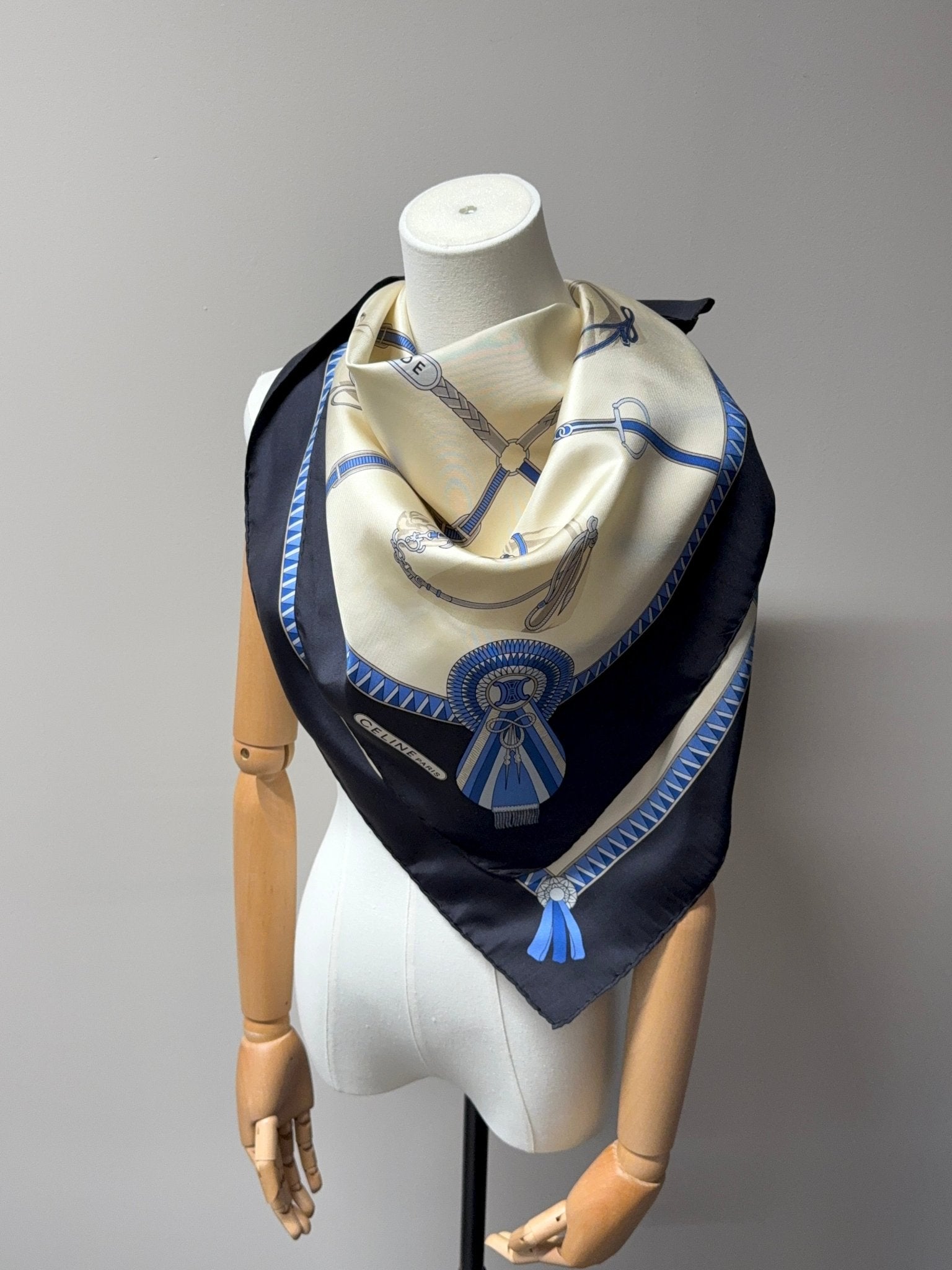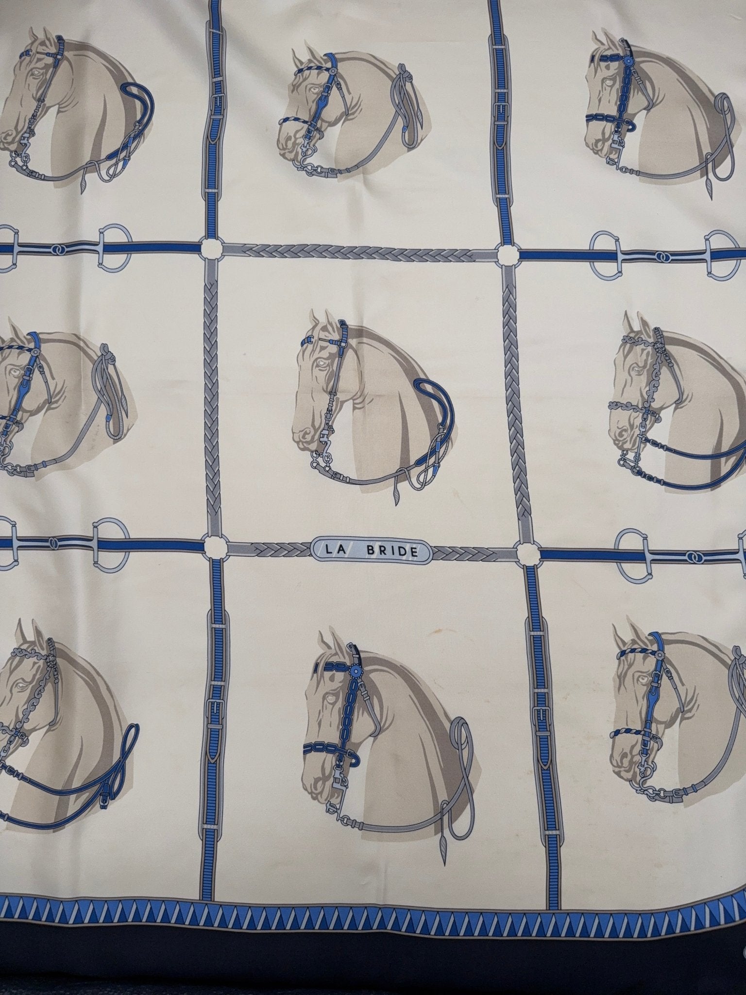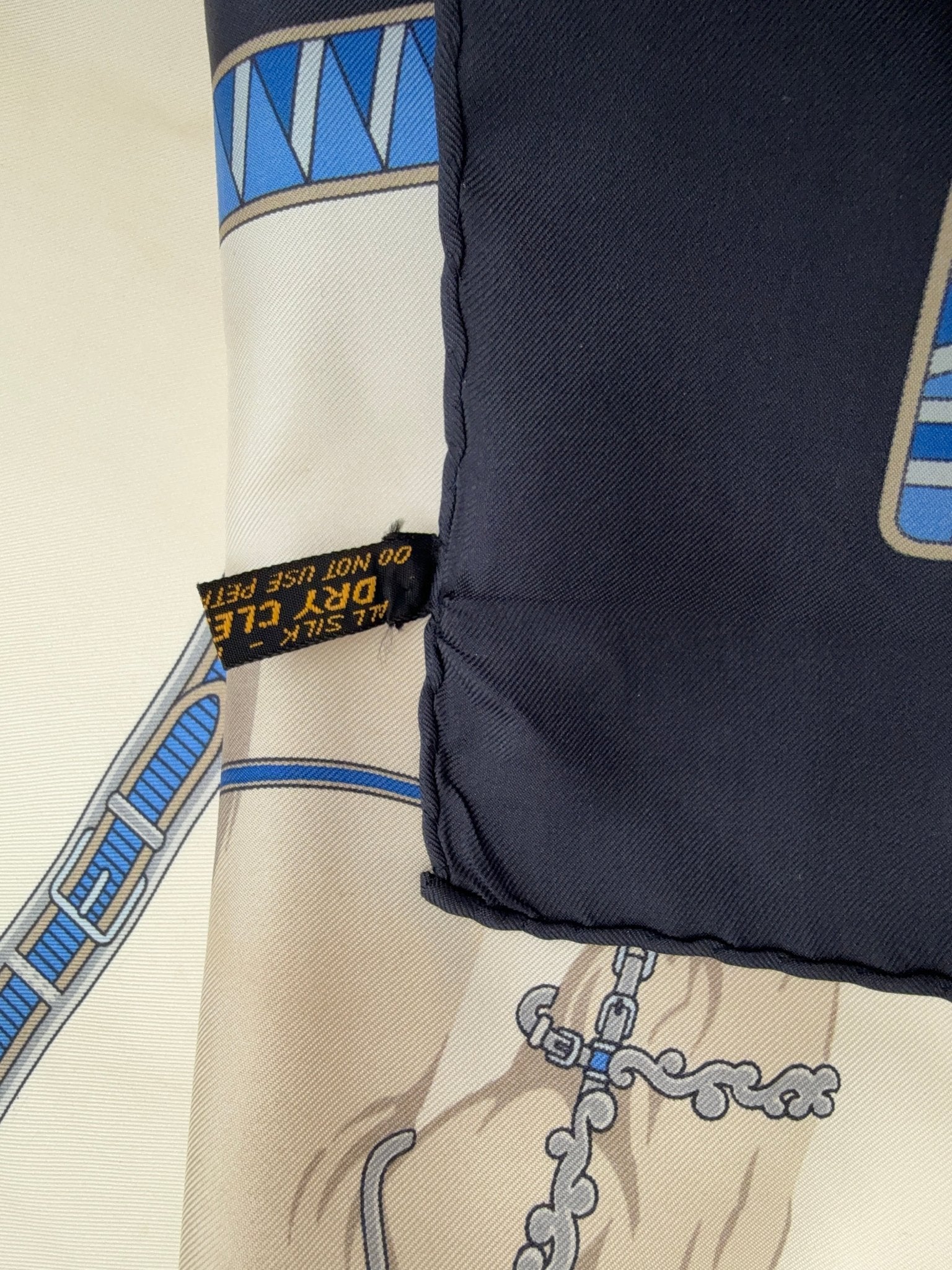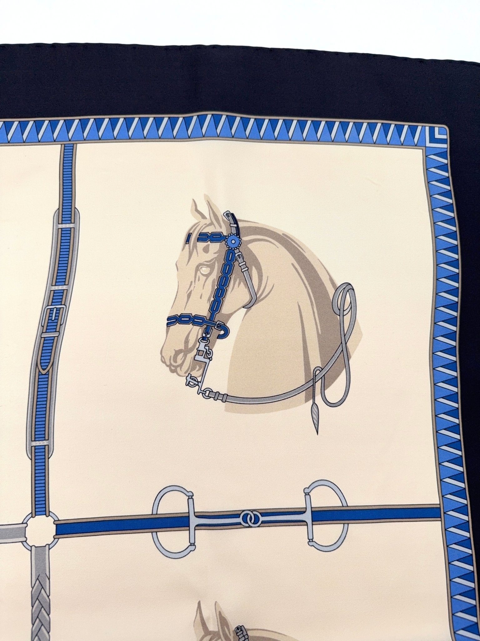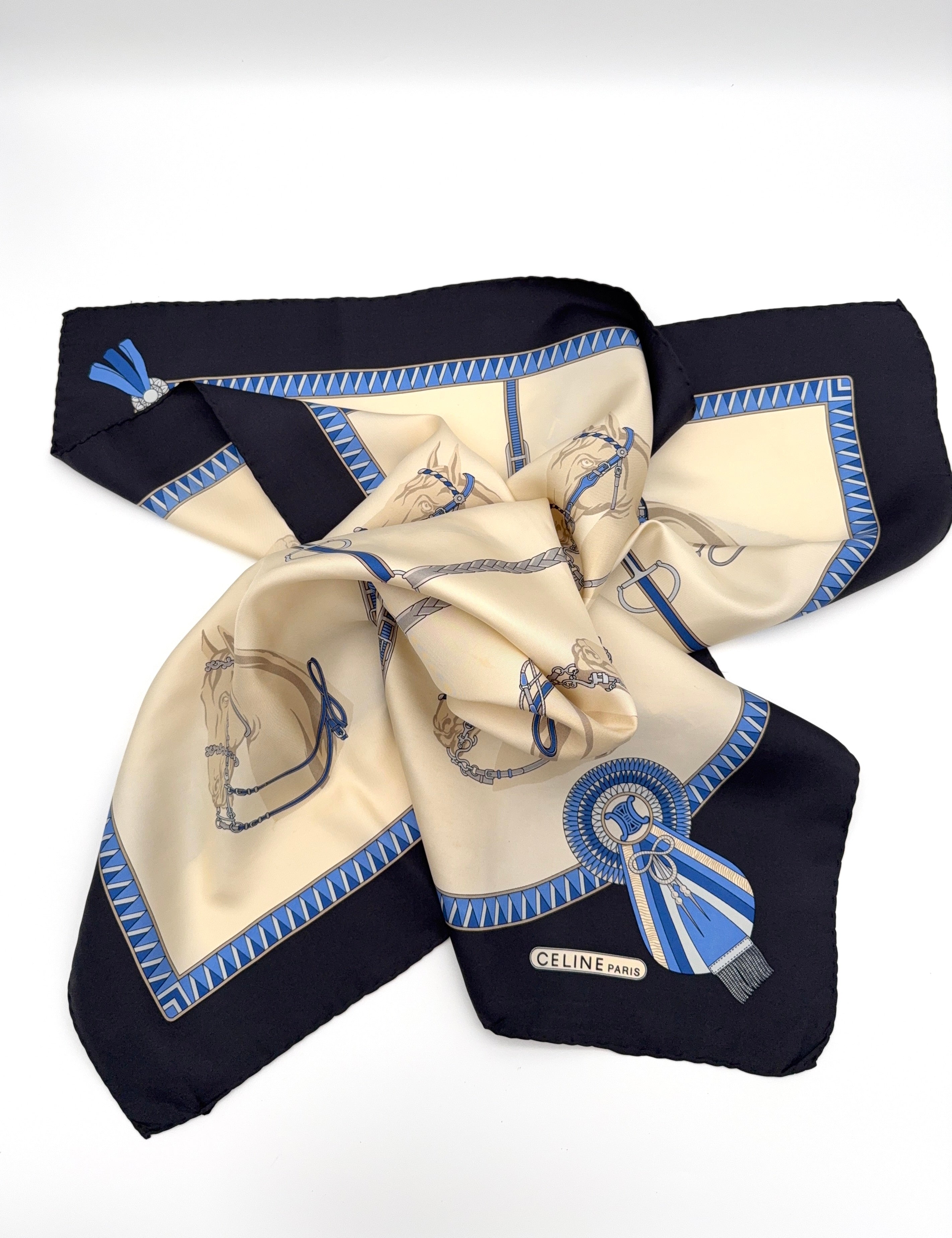 Dieses elegante Celine Seidentuch vereint klassische Pariser Mode mit feiner Handwerkskunst. Das Design „La Bride“zeigt kunstvoll illustrierte Pferdemotive, Zügel und Reitaccessoires in Beige-, Blau- und Grautönen, eingefasst von einem dunkelblauen Rahmen mit geometrischem Muster.