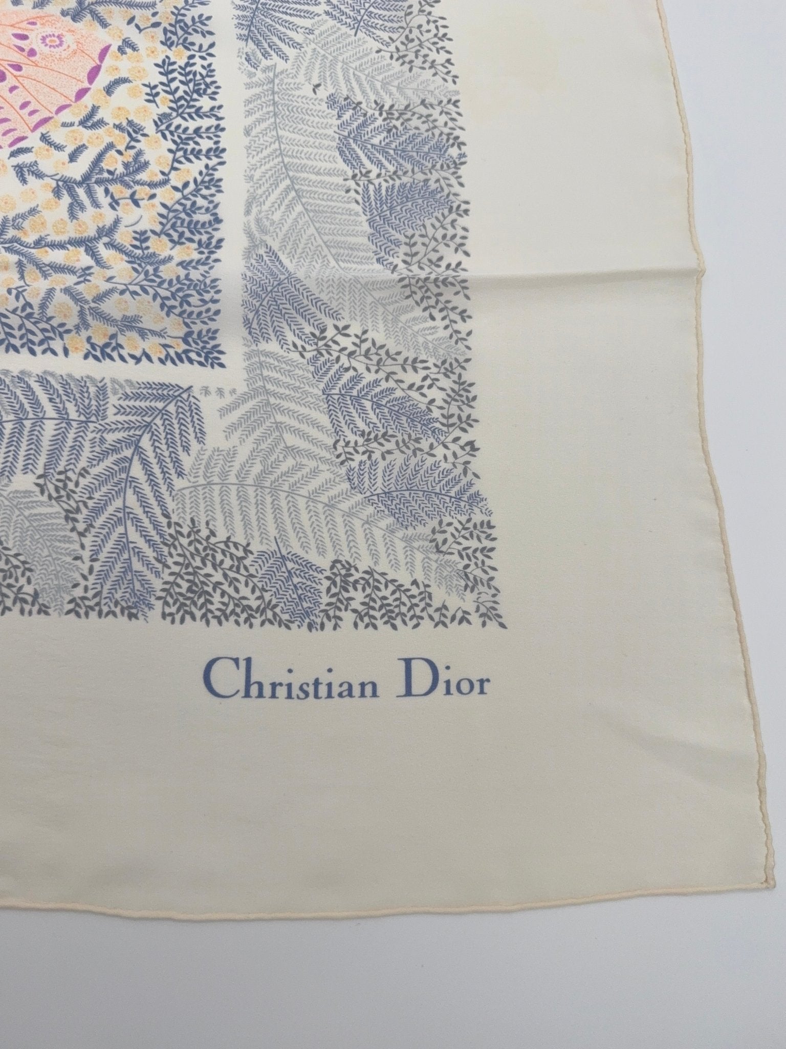 Dieses zarte Christian Dior Seidentuch verkörpert feminine Eleganz des französischen Couture-Hauses. Das wunderschöne Design zeigt ein florales Arrangement mit Schmetterlingen, Blüten und filigranen Farnmustern in sanften Tönen von Blau, Rosa, Flieder und Apricot auf einem cremefarbenen Hintergrund. Ein echter Blickfang – sowohl klassisch als Halstuch getragen als auch modern gestylt an Tasche oder Haar.