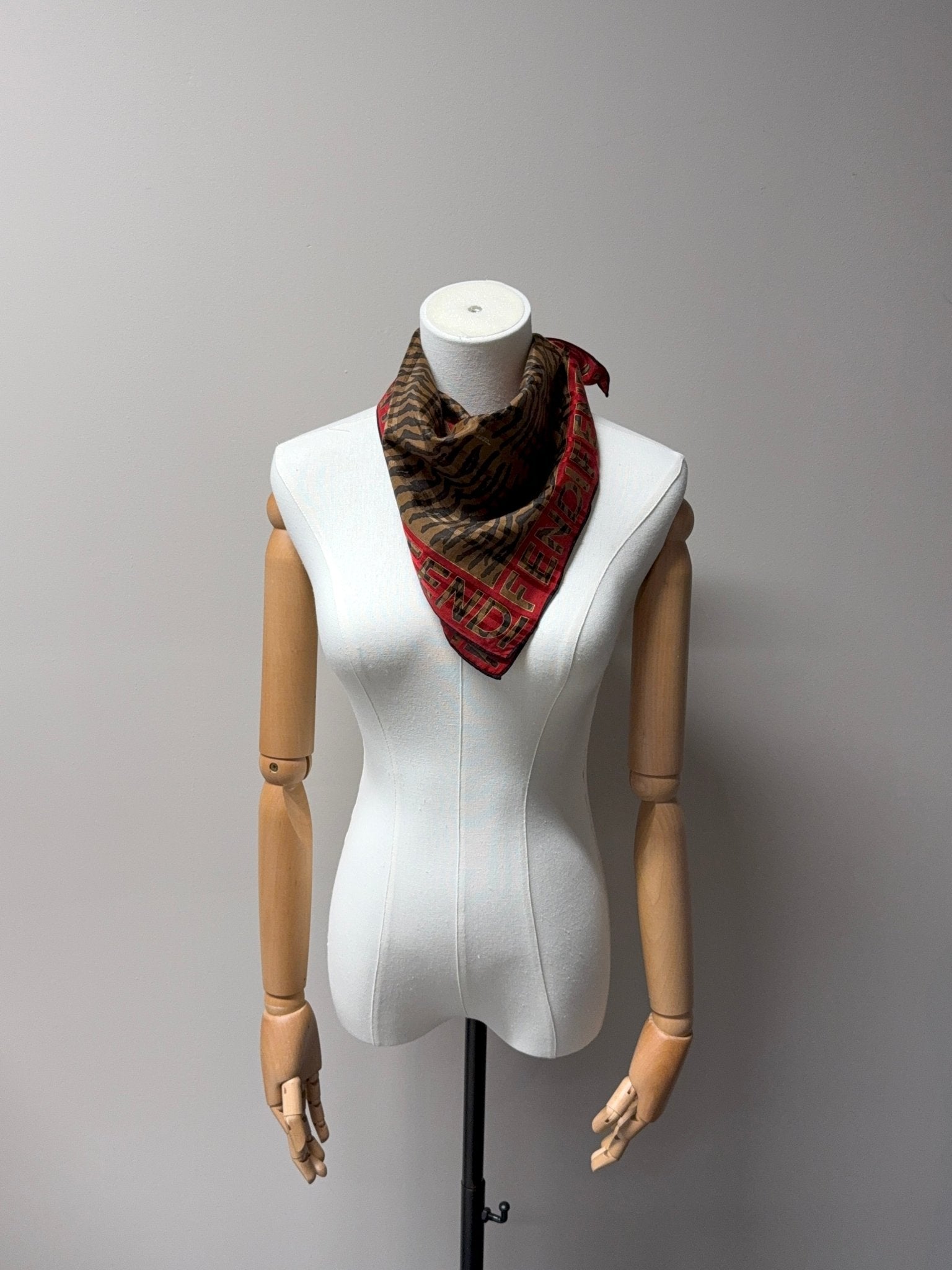 Dieses hochwertige Fendi Vintage Tuch vereint Design mit luxuriöser Materialqualität. Gefertigt aus einer Baumwoll-Seidenmischung, bietet es eine angenehm leichte Haptik und einen eleganten Fall. Das ikonische Fendi-Monogramm kombiniert mit einem stilvollen Leopardenmuster in Braun-Rot verleiht dem Tuch einen markanten, modernen Vintage-Look.