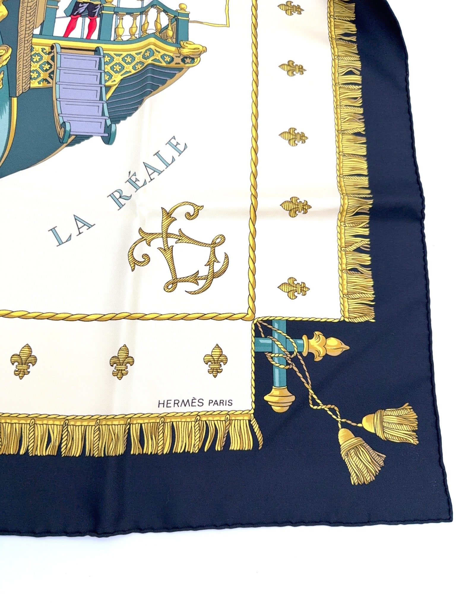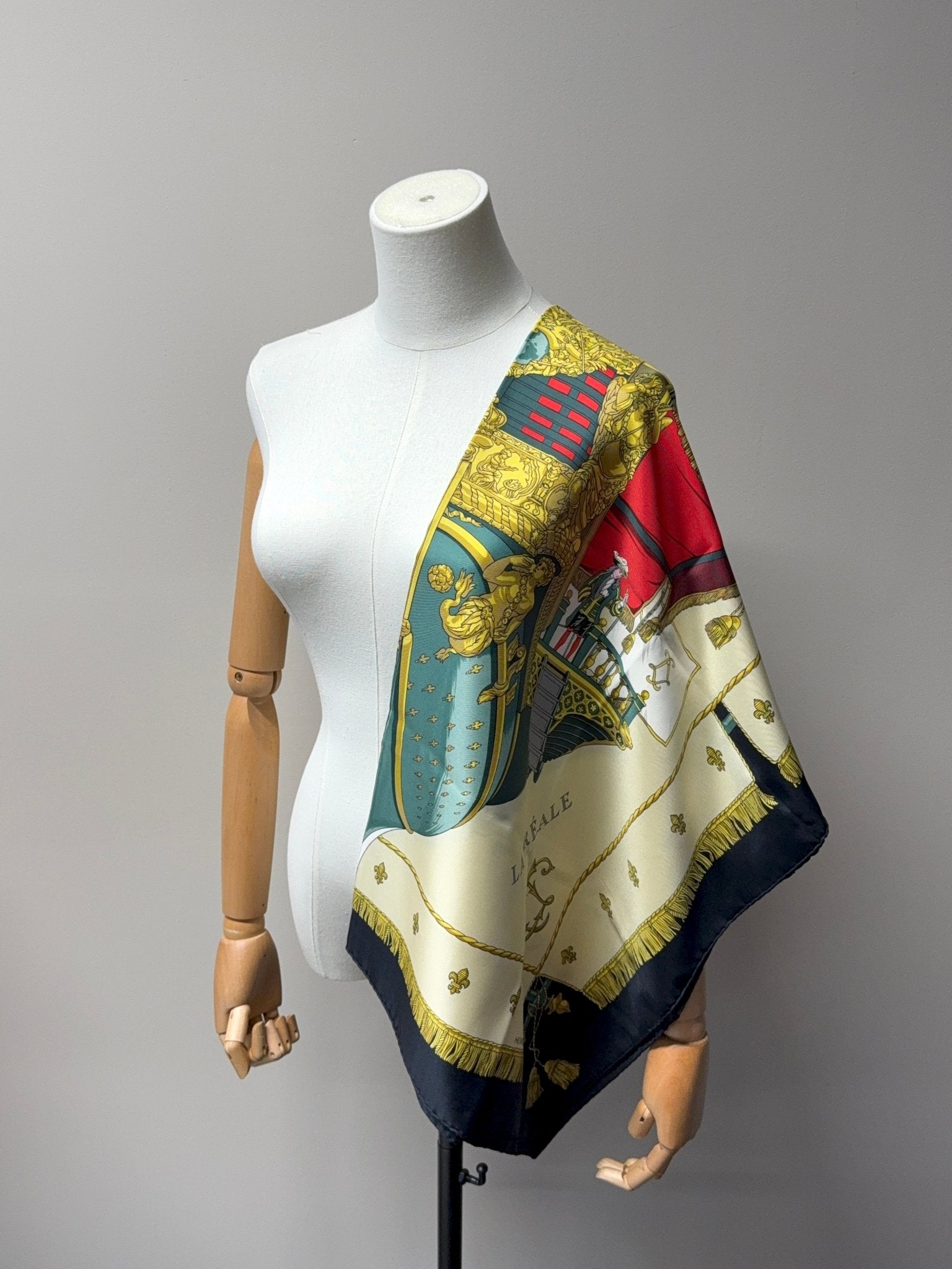 Dieses Hermès Seidentuch ist ein eindrucksvolles Beispiel für die legendäre Handwerkskunst des Hauses Hermès. Das aufwendig gestaltete Design „Vue du Carrosse de la Galère La Réale“ zeigt ein prunkvolles historisches Schiffsornament mit barocken Figuren, goldenen Details und maritimen Elementen. Die harmonische Farbkomposition aus Creme, Dunkelblau, Grün, Gold und Rot verleiht dem Tuch eine zeitlose Eleganz und macht es zu einem begehrten Sammlerstück.