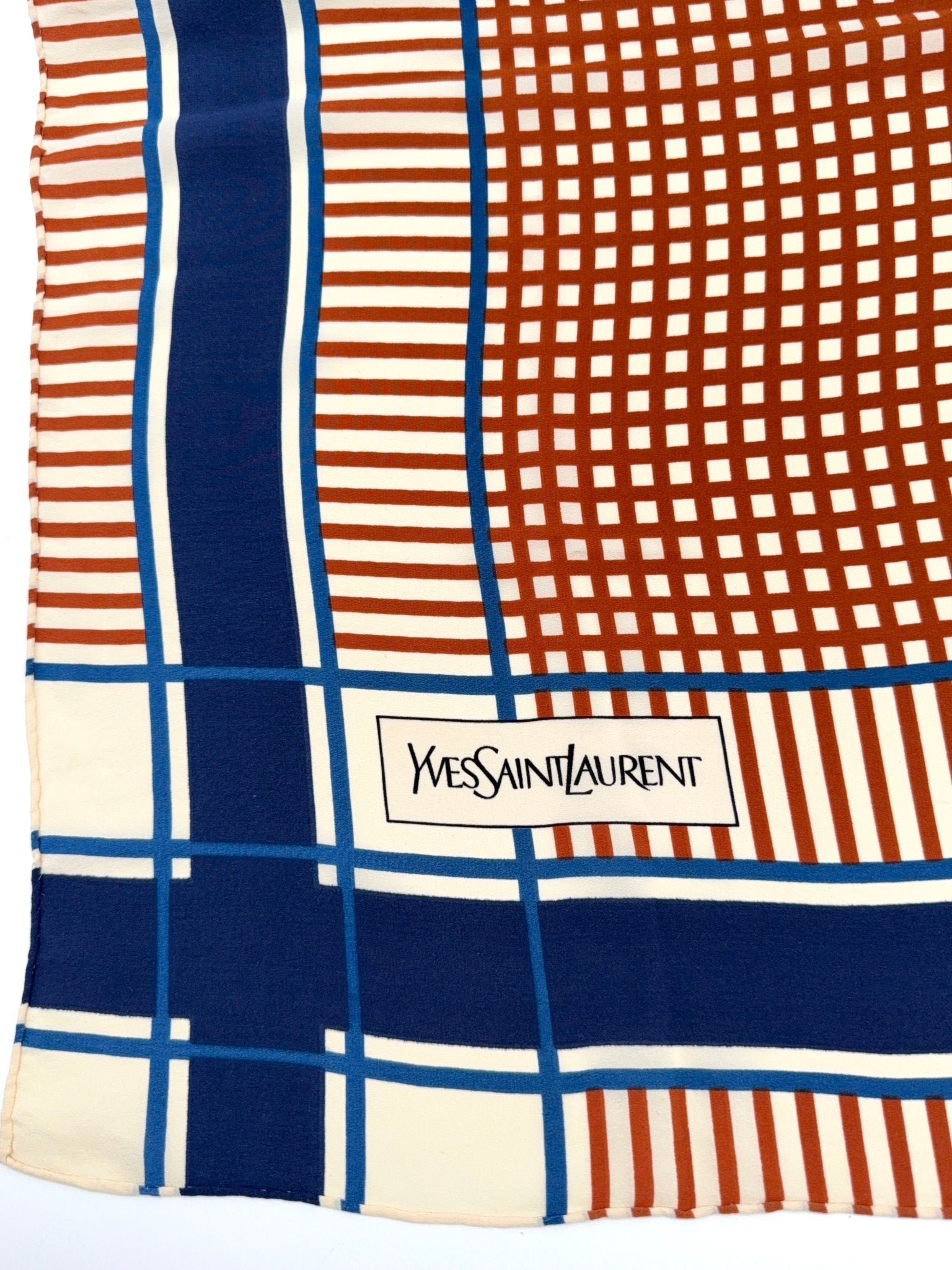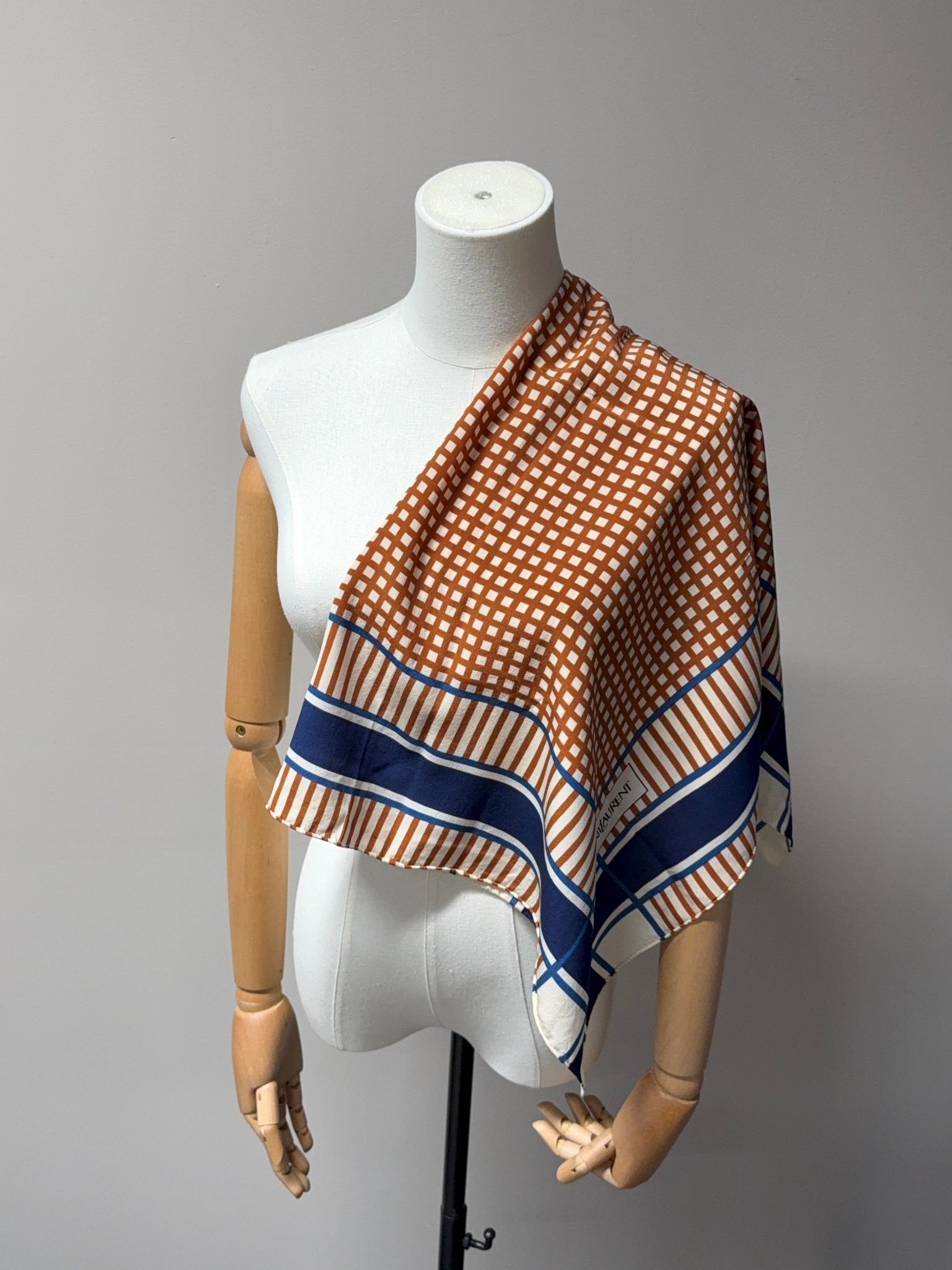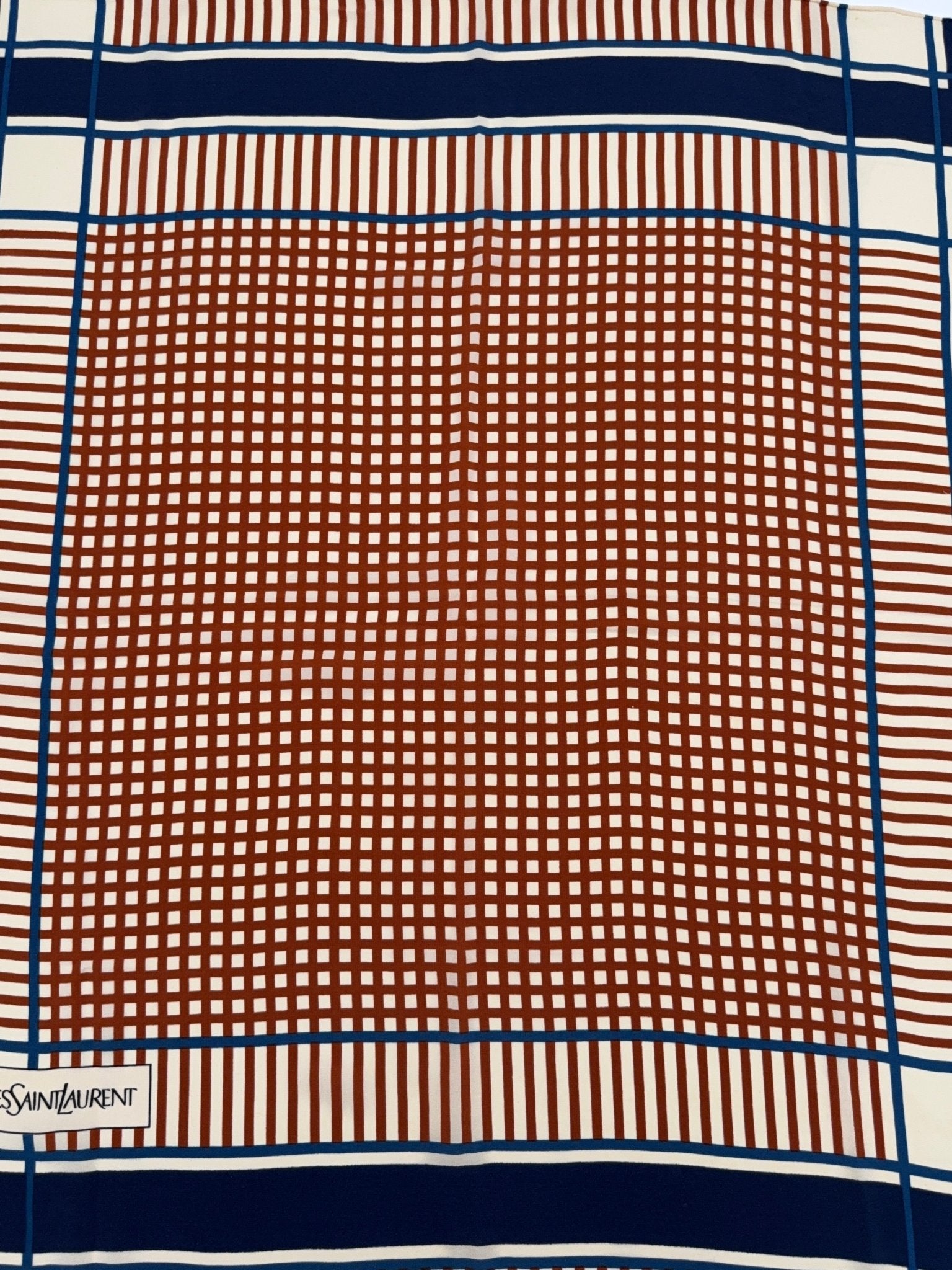 Yves Saint Laurent Seidentuch, das geometrische Muster aus Karos und Streifen in Rostbraun, Marineblau und Cremeweiß verkörpert den unverwechselbaren Stil des Hauses YSL – klassisch, modern und mühelos chic.