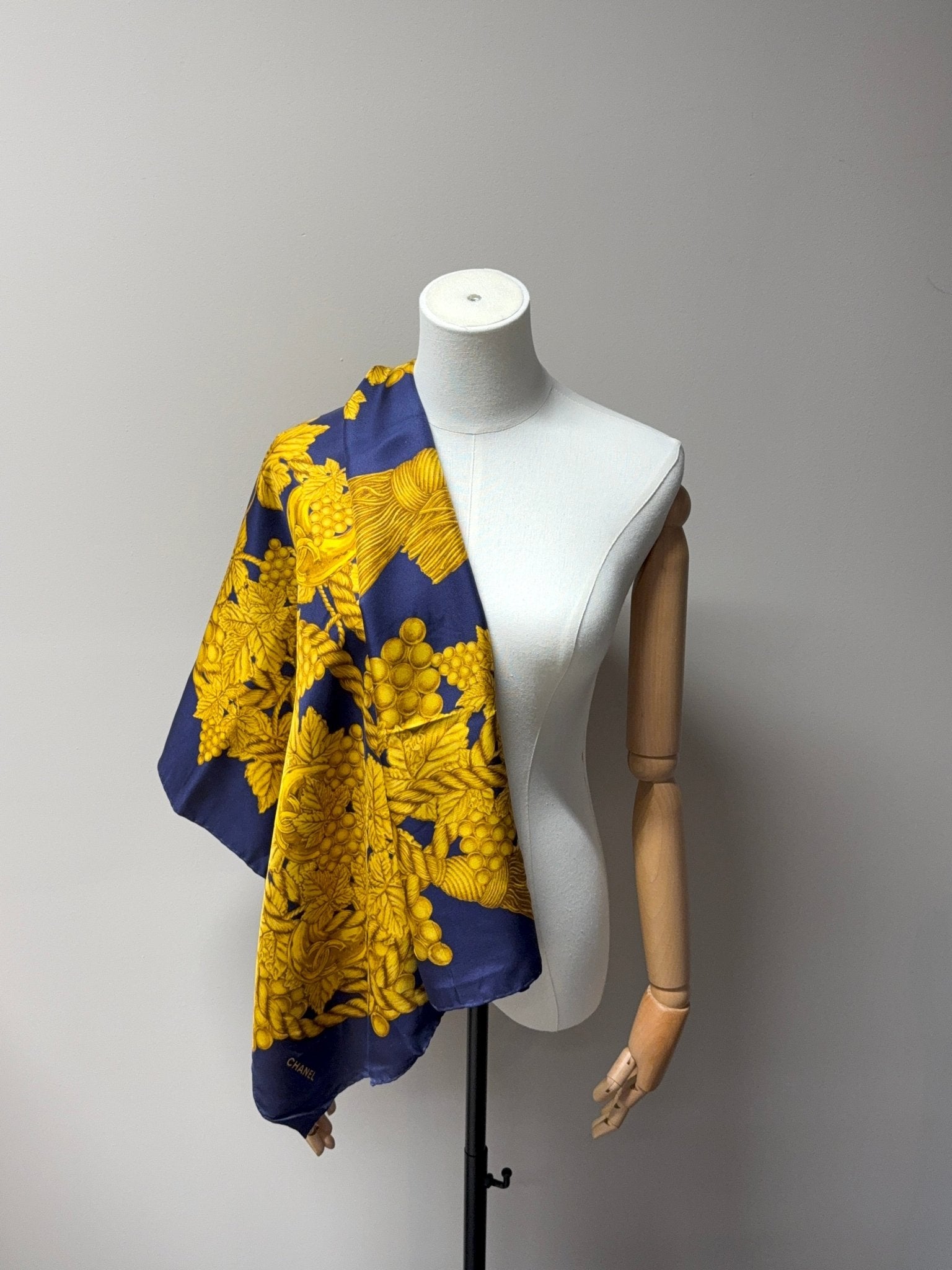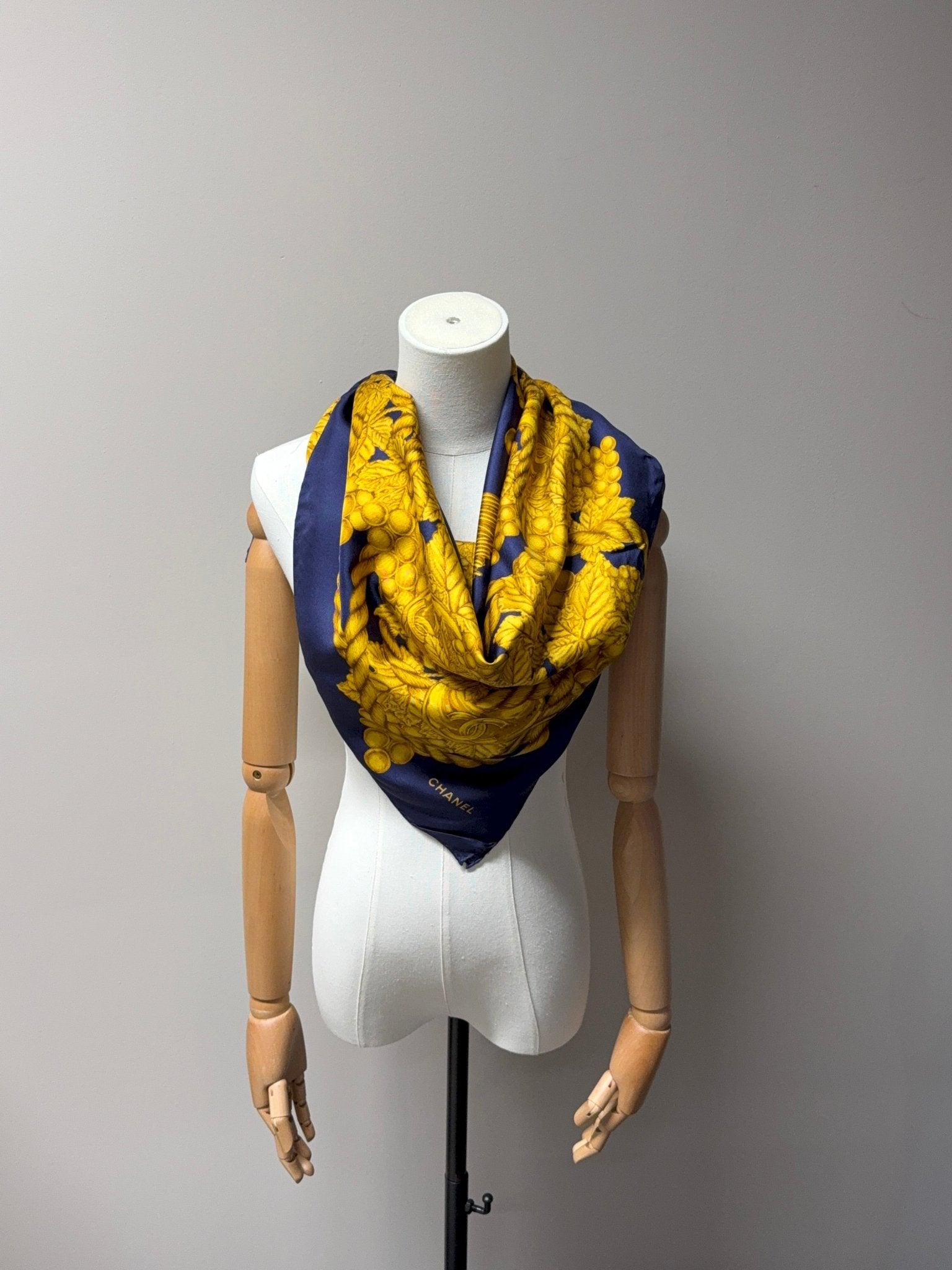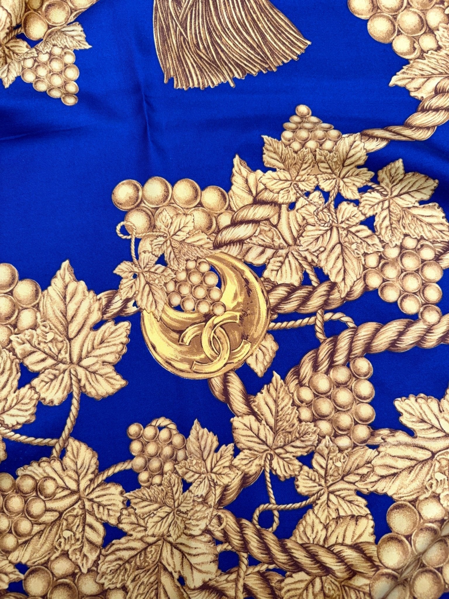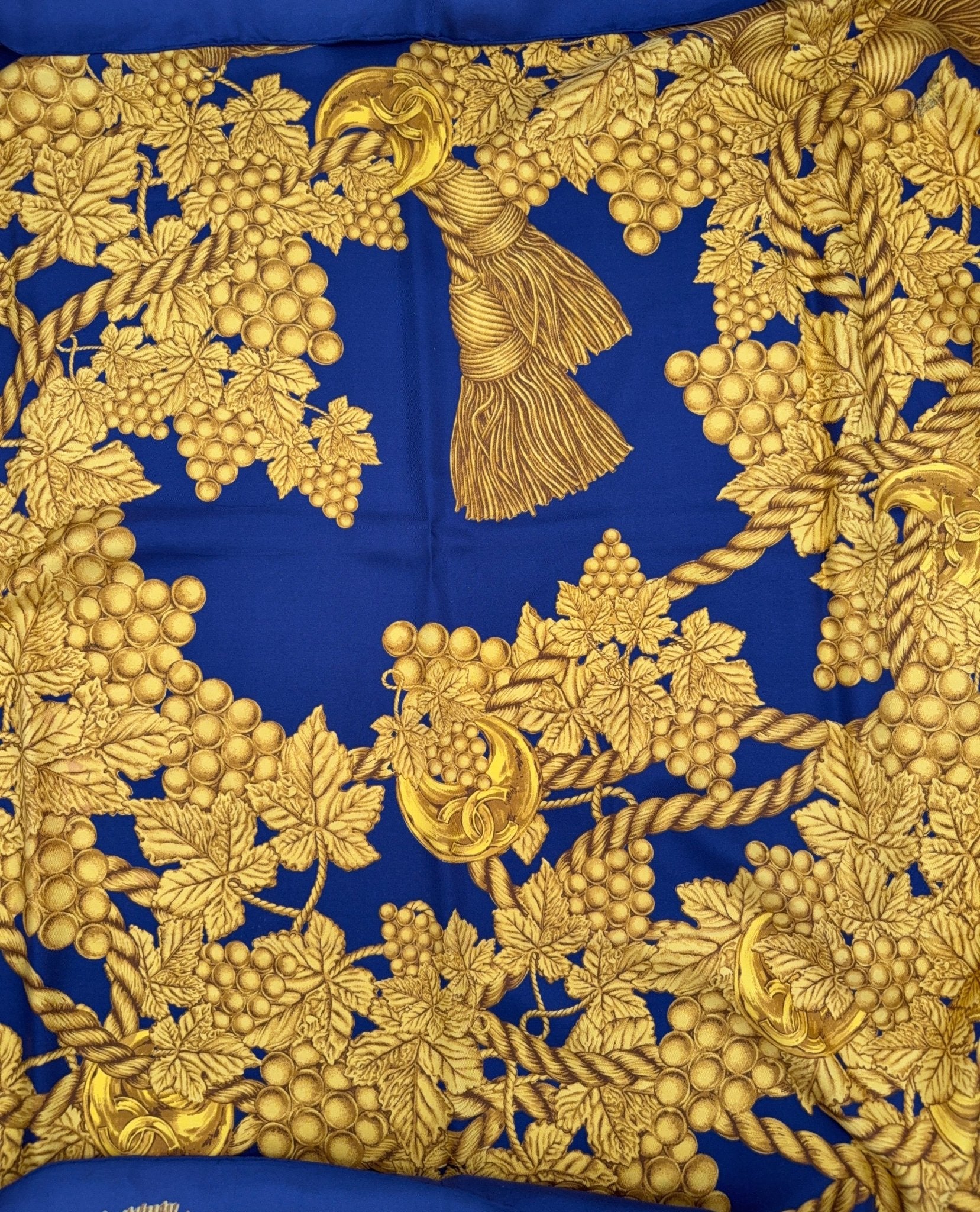This Chanel silk scarf is a timeless vintage accessory that impresses with its classic design and high-quality craftsmanship. Made from pure silk and featuring hand-rolled edges, it embodies the signature elegance of the Chanel brand. The sophisticated blue and gold colors make it a versatile highlight for any wardrobe.