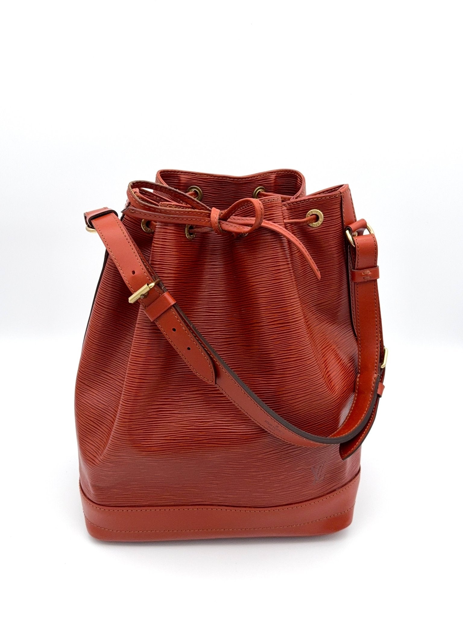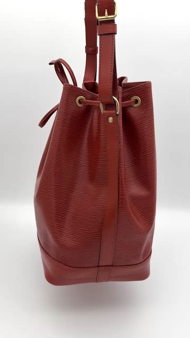 Die Louis Vuitton Sac Noé Grande in braunem Epi-Leder ist ein zeitloser Klassiker, der durch seine strukturierte Oberfläche, Robustheit und elegante Optik überzeugt. Die Tasche bietet reichlich Platz und ist ideal für den Alltag oder zum stilvollen Reisen.