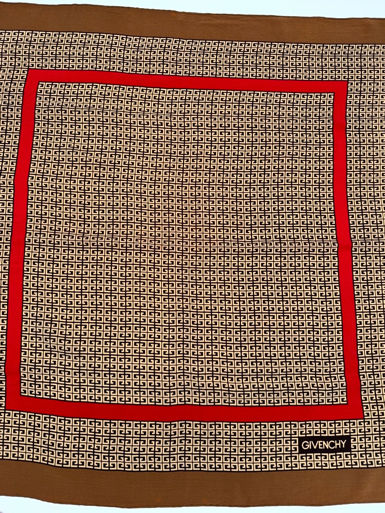 This elegant Givenchy silk scarf is a high-quality vintage accessory that impresses with its classic Givenchy monogram and sophisticated color combination of brown with red details. Crafted from pure silk, it embodies the luxury and fine craftsmanship of the House of Givenchy.